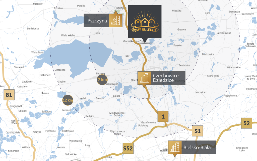 Lokalizacja Domów na Letniej to jednak nie tylko sąsiedztwo pięknych terenów zielonych i rekreacyjnych, ale także świetnie skomunikowana okolica. Tylko 2 kilometry będą dzielić przyszłych mieszkańców od drogi krajowej DK1 Katowice – Bielsko-Biała, która ułatwia komfortowe poruszanie się po całym regionie. Położenie inwestycji gwarantuje również szybki dojazd do takich miast jak: Pszczyna, Tychy, Katowice, Czechowice-Dziedzice czy wspomniana Bielsko-Biała. Niedaleko także do kurortów narciarskich. Jeśli ktoś akurat nie dysponuje samochodem, może skorzystać z pobliskiej linii kolejowej, którą kursują szybkie pociągi Intercity oraz Koleje Śląskie.