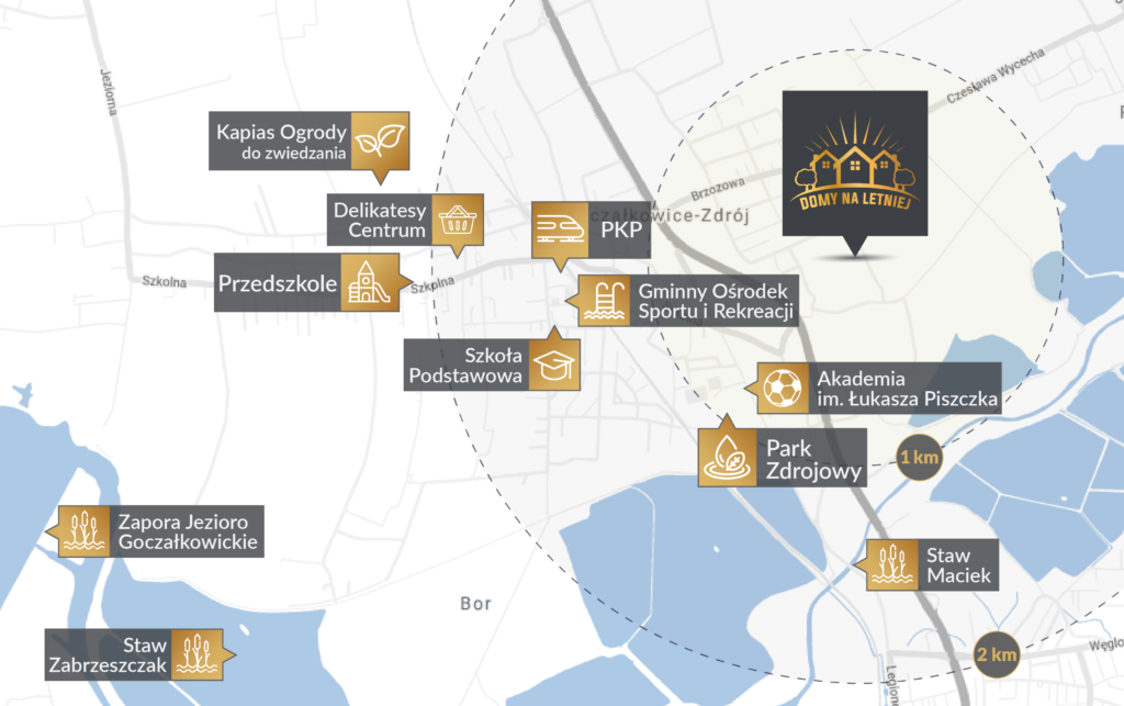 Okolica osiedla to również szereg innych ciekawych miejsc, idealnych na weekendowy lub popołudniowy wypad. Niedaleko są m.in.: Ogrody Kapias, Park Zdrojowy, Rezerwat przyrody Żubrowisko oraz Muzeum Zamkowe w Pszczynie z przepięknym Parkiem Zamkowym. Dla rodzin z dziećmi dużym udogodnieniem będzie bliskość szkoły, przedszkola, basenu i Akademii piłkarskiej BVB im. Łukasza Piszczka. Szybko można również dostać się – korzystając z własnego samochodu, stacji PKP lub przystanku autobusowego – do większych miast – Goczałkowice-Zdrój graniczą ze wspomnianą Pszczyną i Czechowicami-Dziedzicami.