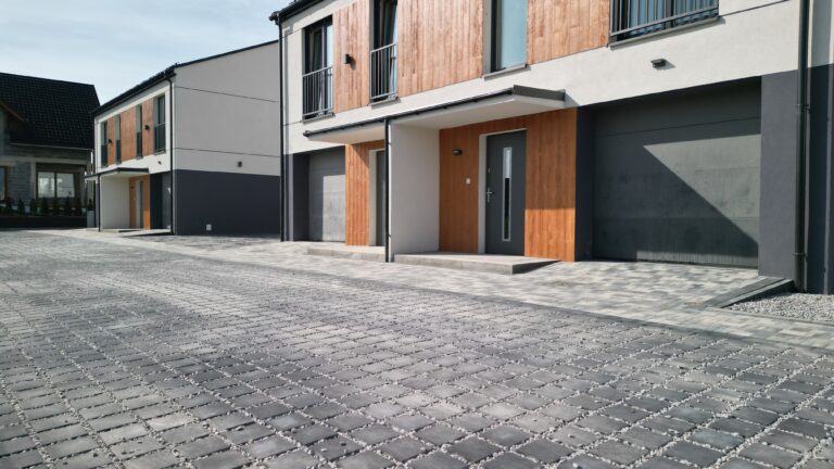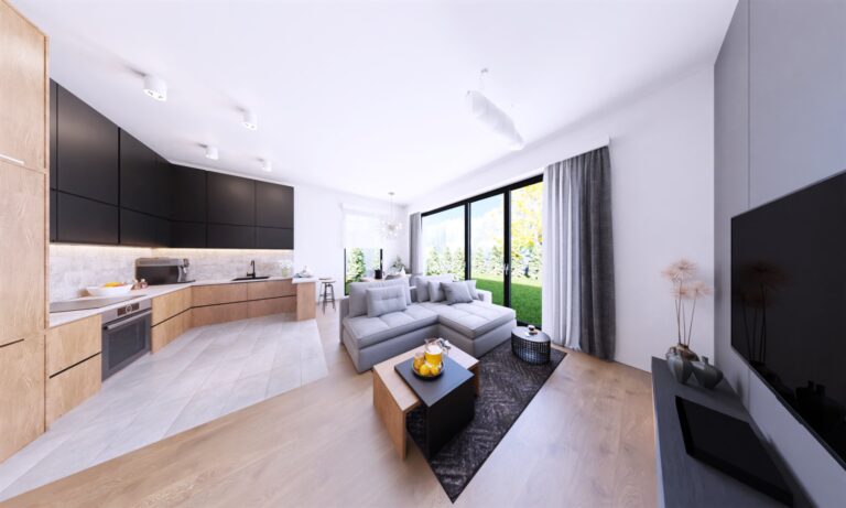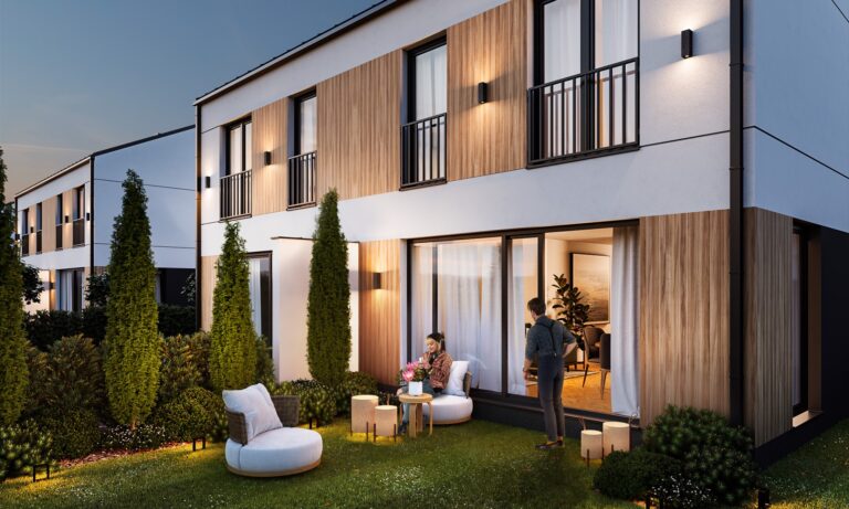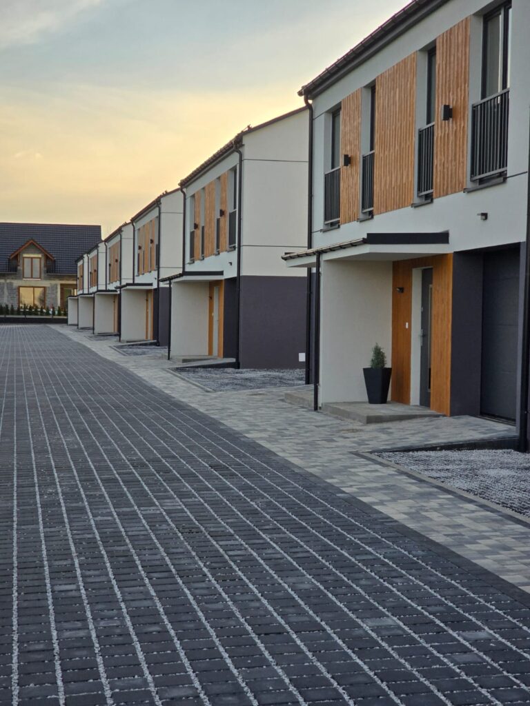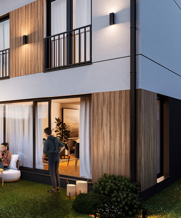 Każdy dom posiada również duży indywidualny, ogrodzony ogród – komfortową przestrzeń do odpoczynku na świeżym powietrzu, do którego wychodzi się przez bardzo duże drzwi przesuwne, które (podobnie jak przeszklenia na piętrze) gwarantują idealne nasłonecznienie wnętrz. W bryłach budynków znajdują się przestronne garaże, a obok nich miejsca postojowe, więc nigdy nie zabraknie przestrzeni dla samochodów należących do mieszkańców lub ich gości.